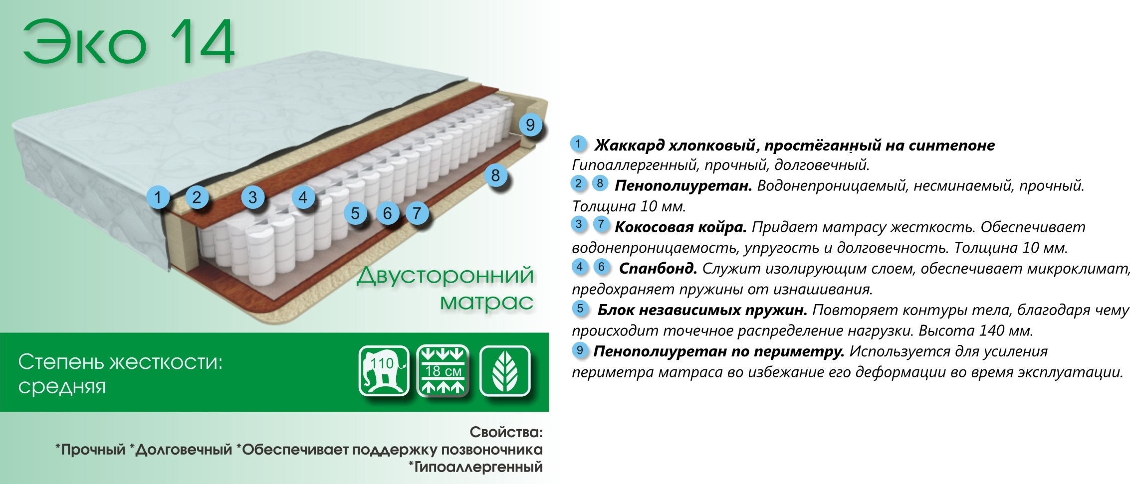 Эко 14 - средняя жесткость. Это матрас является самым простым и долговечным. Обеспечивает поддержку позвоночника и абсолютно Гипоаллеренный